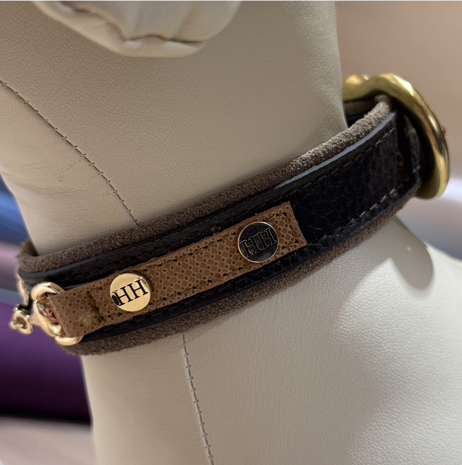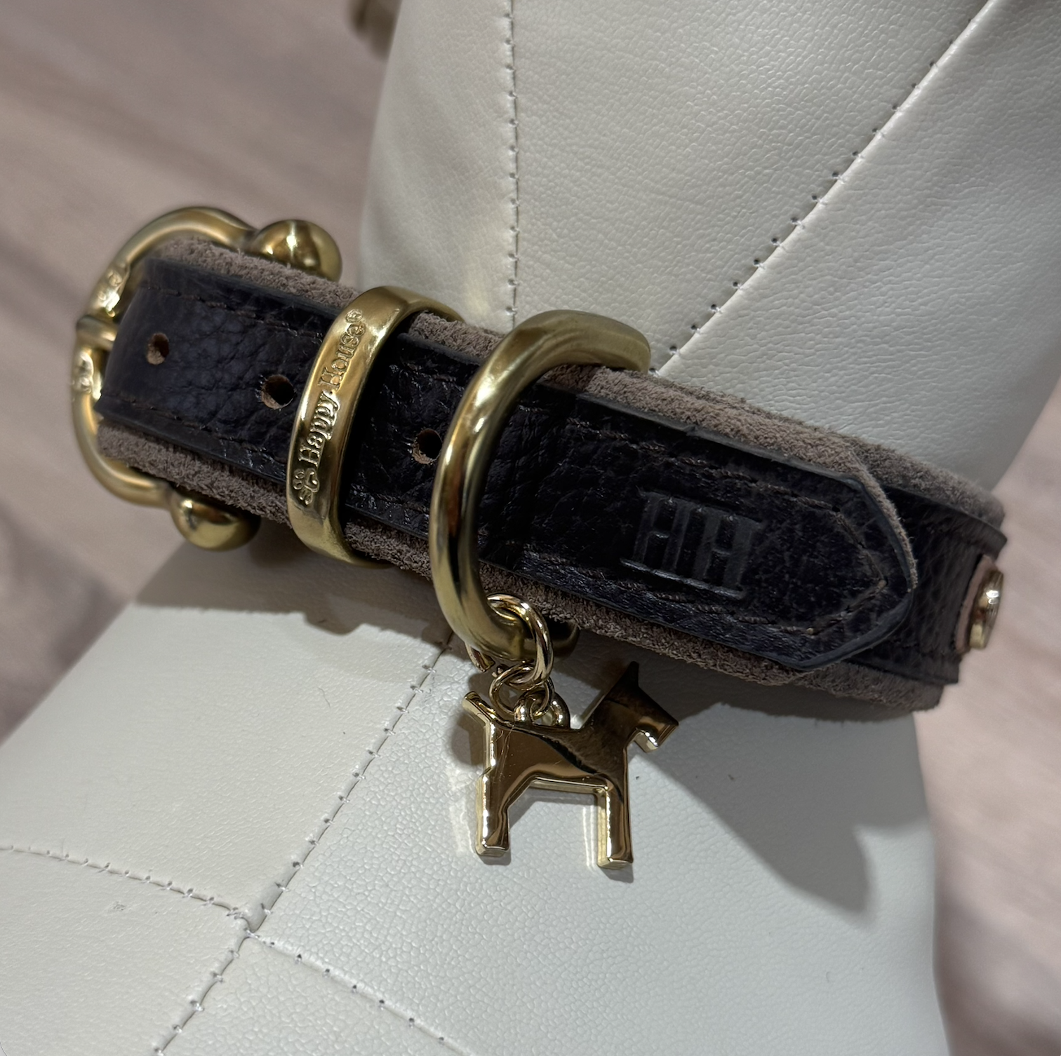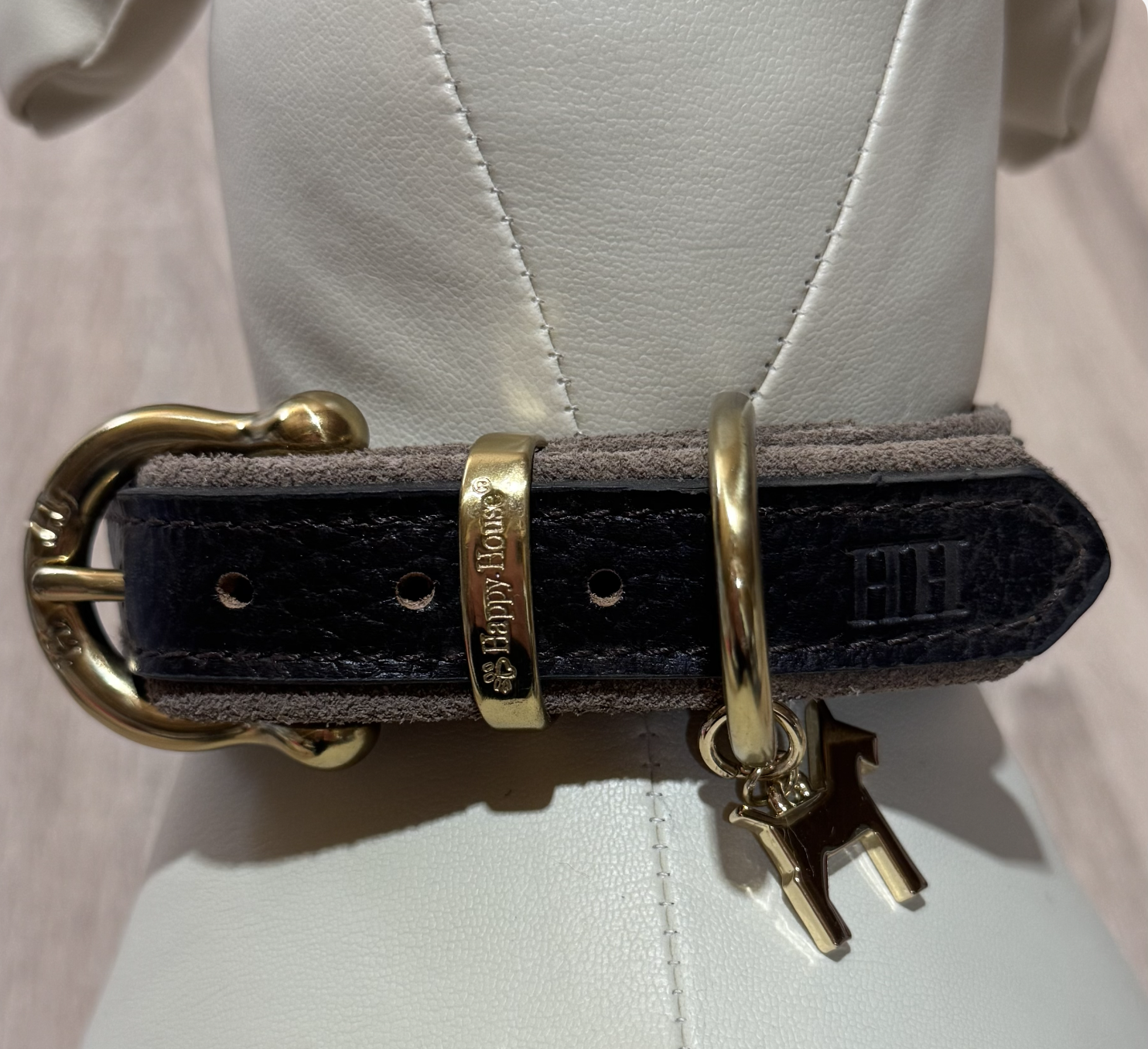 Voor wie houdt van stille klasse: deze HappyHouse halsband in donkerbruin zadelleer combineert een tijdloze look met verfijnde details. Het diepe zwart krijgt extra uitstraling door de goudkleurige hardware en het herkenbare HappyHouse-bedeltje. Een halsband die chic blijft, zowel bij een dagelijkse wandeling als bij een feestelijke outfit.
