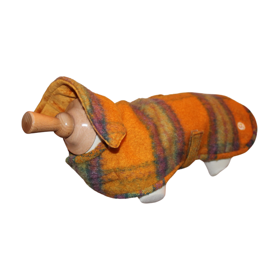 Laat uw viervoeter stralen in deze elegant afgewerkte hondenjas, vervaardigd uit een warme roestkleurige geborstelde tartan met subtiele tinten van mosgroen, paars en oker. Deze zachte, gemêleerde wolblend heeft een warme, herfstige uitstraling en biedt optimaal comfort tijdens frisse wandelingen.