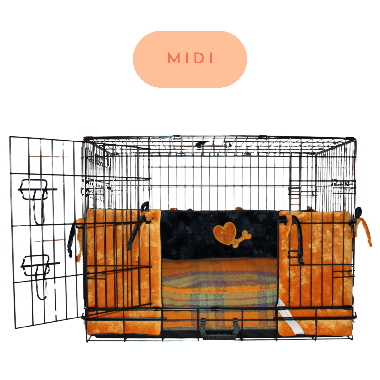 Opvallend detail: een speels hartje met botje op de achterzijde in bijpassend oranje fluweel, een uniek en vrolijk accent.